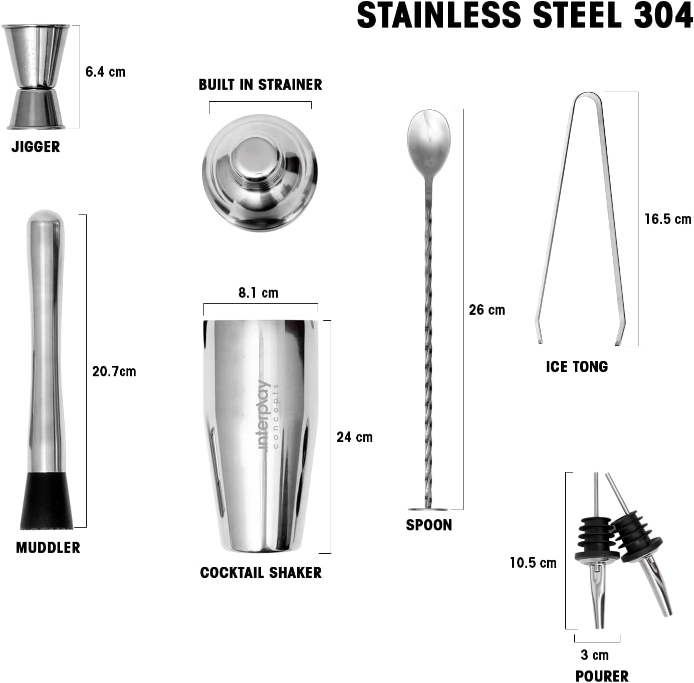 Upgrade your home bar with this premium 8-piece cocktail shaker set by Interplay Concepts. Made from food-grade 304 stainless steel, it’s durable, rust-resistant, and built for everyday use.